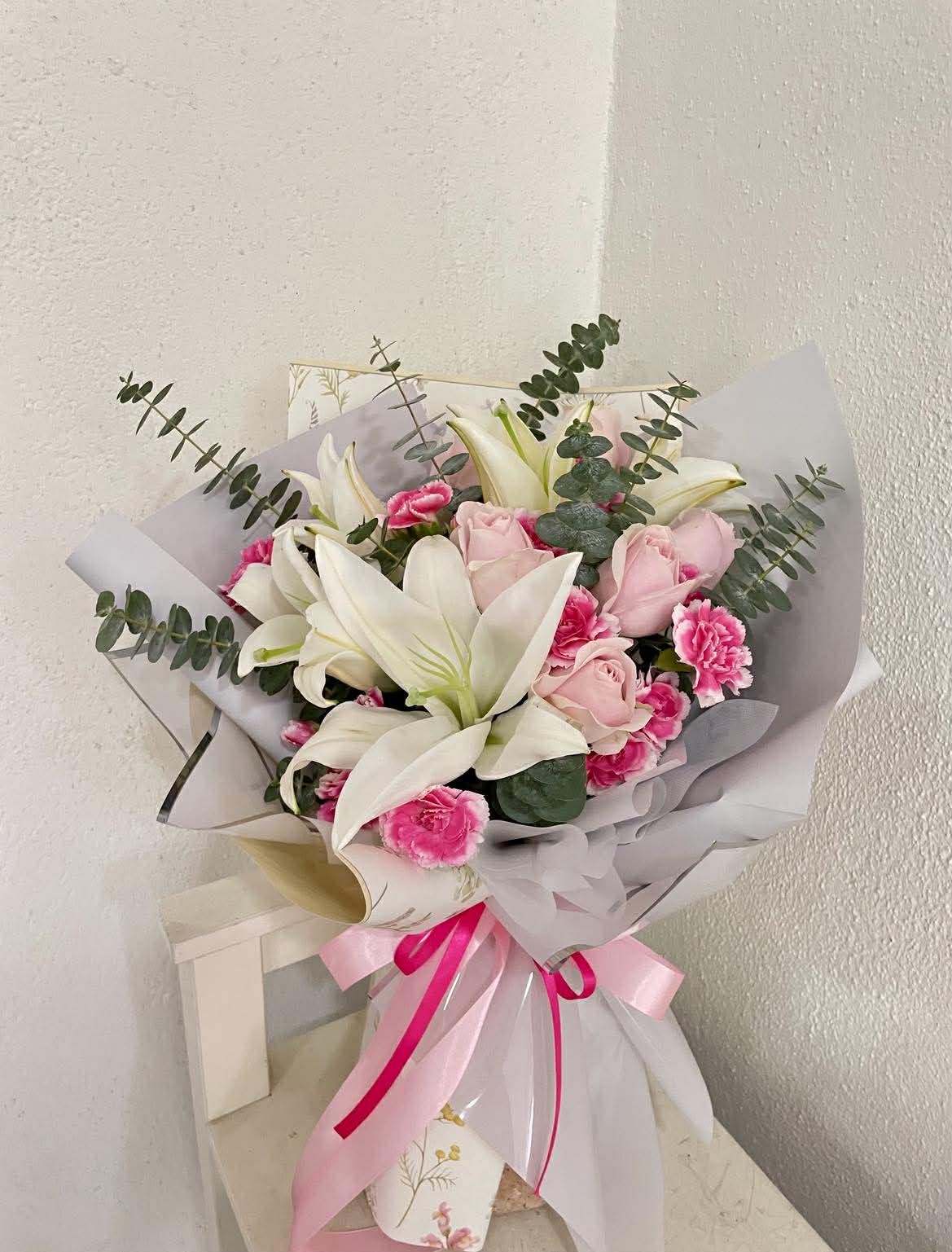 2stem Lilies 6tem Roses pink and mini Carnation flower