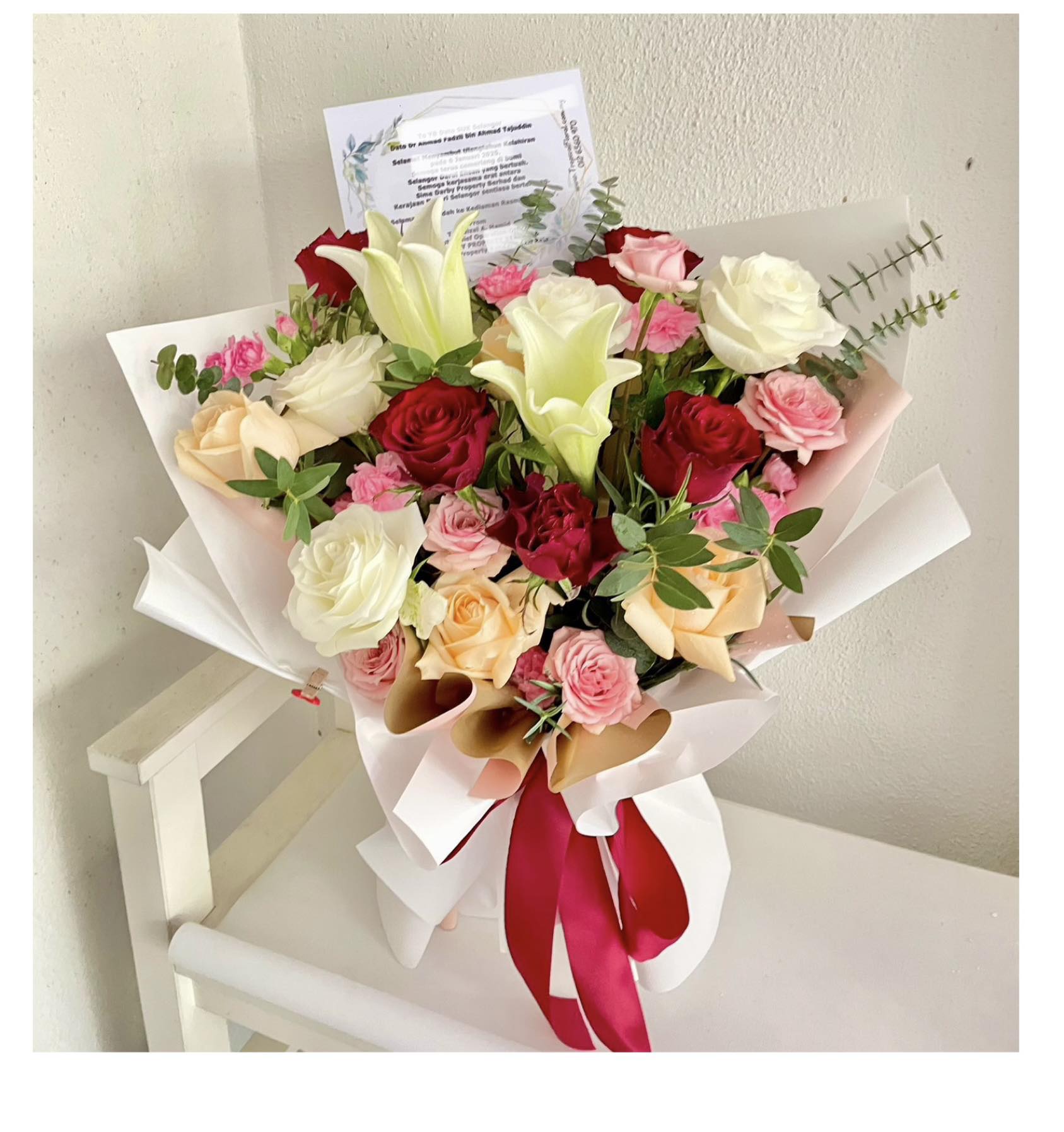 13stk rose mix colour, 3stk mini roses and mini carnation and 2 mandona lilies