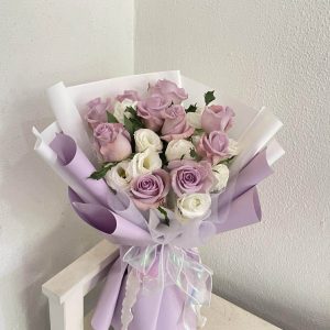 10 stalk red roses with baby flower and leaves.